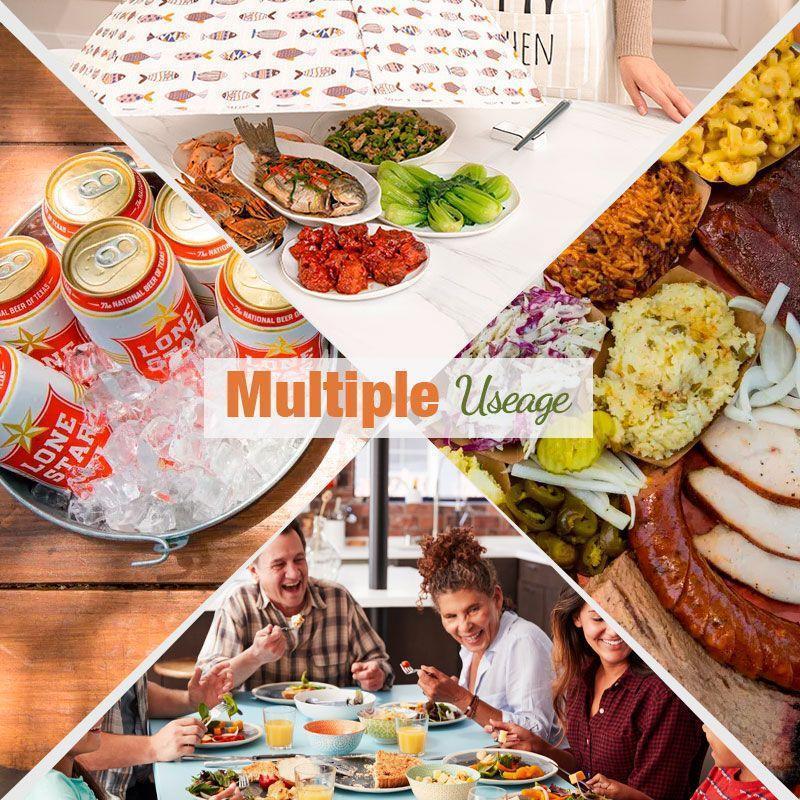 These covers not only work perfect for an outdoor party, camping, cooking activities, BBQ, picnic, or home kitchen on bowls, plates, utensils, any opened drinks, snacks, and fruit but they also keep salads cool and hot food warmer for longer.